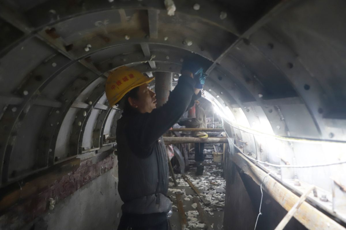 工人們正抓緊龍溪橋水庫涵洞施工