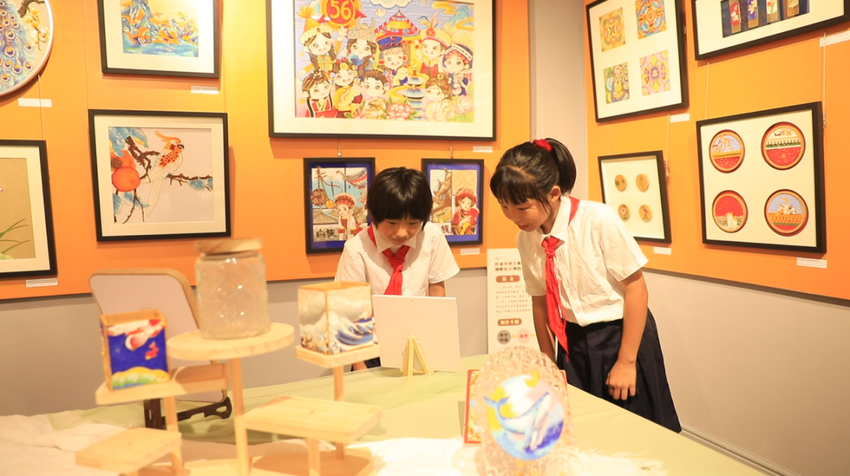 ▲孩子們在慶‘六一’青少年美術(shù)作品展欣賞優(yōu)秀作品